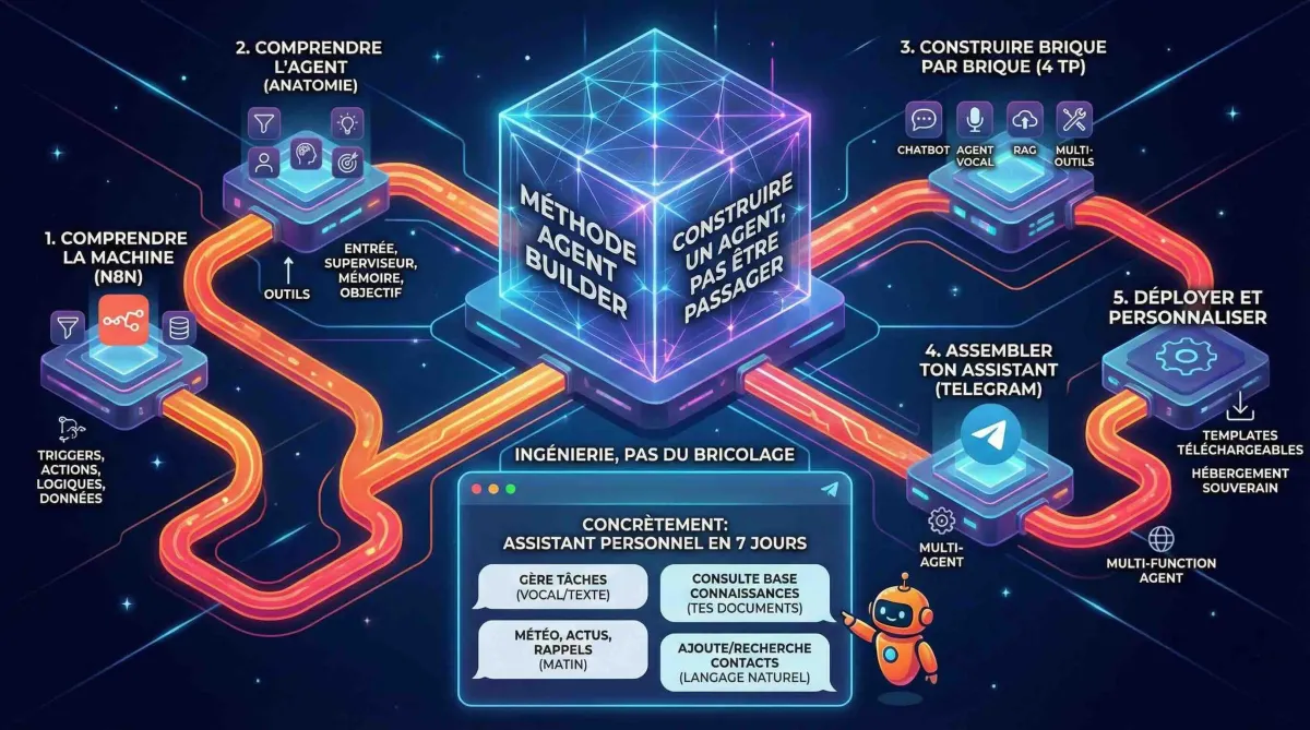 La Méthode Agent Builder, c'est un parcours progressif en 5 étapes :