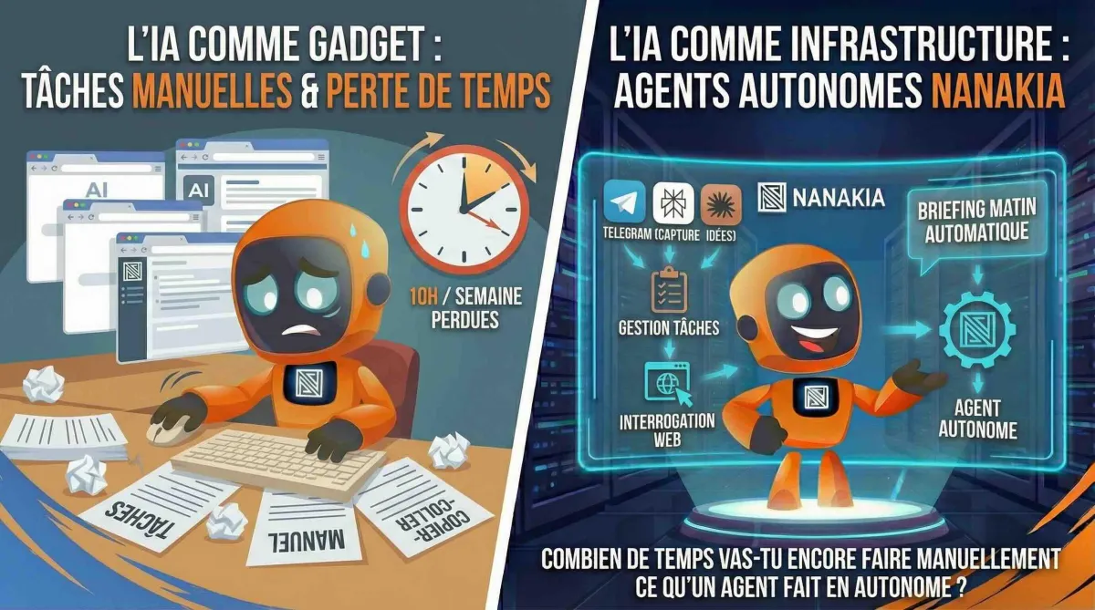 Les premiers perdent 10h par semaine en tâches manuelles qu'une machine fait en 10 secondes. Les seconds ont un assistant Telegram qui capture leurs idées, gère leurs tâches, interroge le web, et leur envoie un briefing chaque matin — automatiquement.