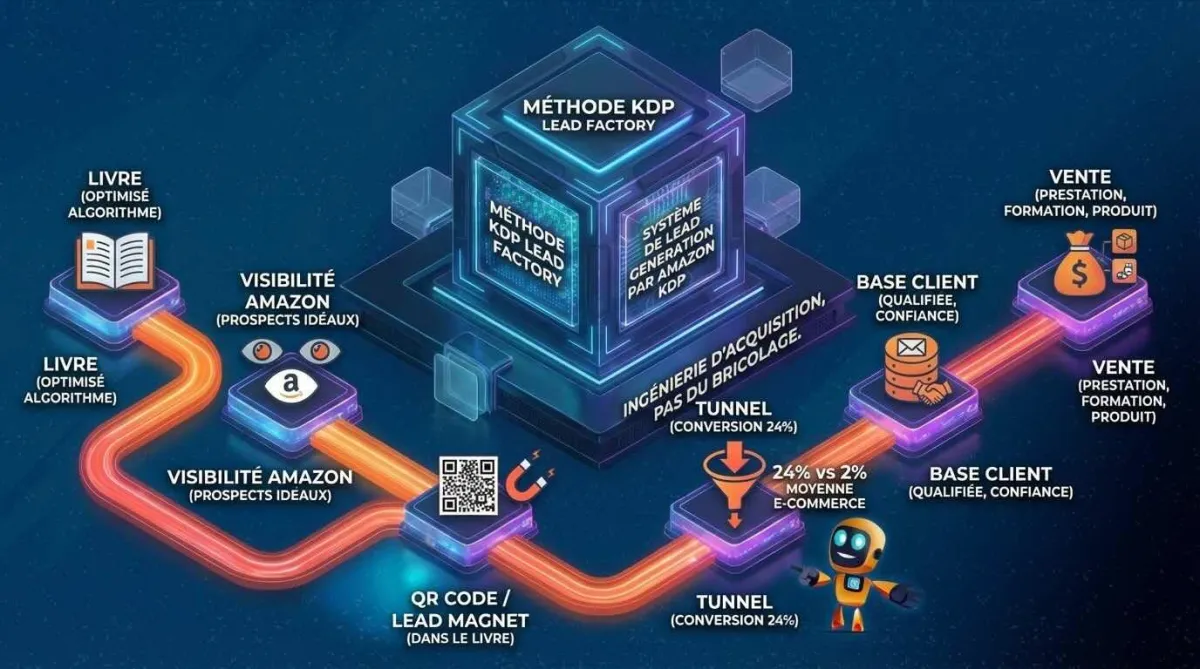 Tu as besoin d'un système de Lead Generation par Amazon KDP — une infrastructure qui transforme tes compétences en un livre, ce livre en visibilité, et cette visibilité en prospects qualifiés.