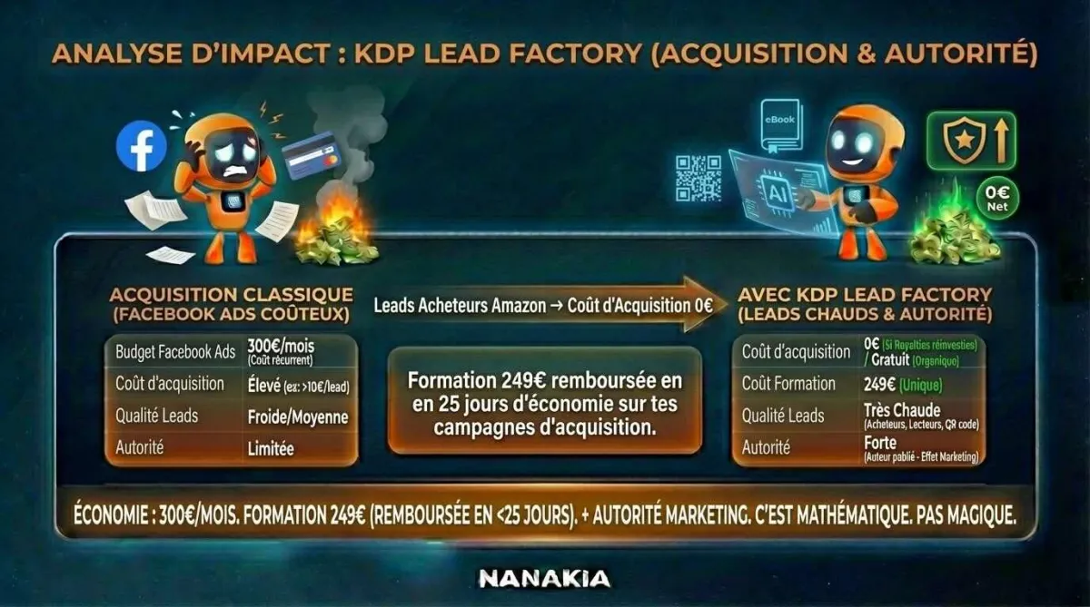 Coût d'acquisition ? Si tu réinvestis 100% de tes royalties en pub Amazon : 0€ net.