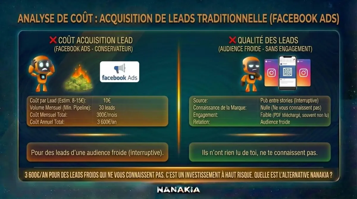 Tu retournes sur tes campagnes Facebook Ads. Le CPL a encore grimpé. 11€. 14€. Tu ajustes le ciblage, tu changes la créa, tu relances un A/B test. Et pendant que tu "optimises", ton compte en banque, lui, fond.