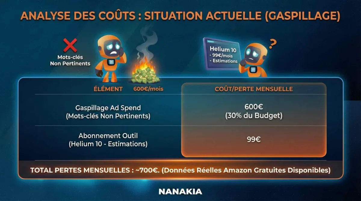Et tu paies en plus : Helium 10 (99€/mois) pour des estimations de volume. Amazon te donne les volumes réels gratuitement.