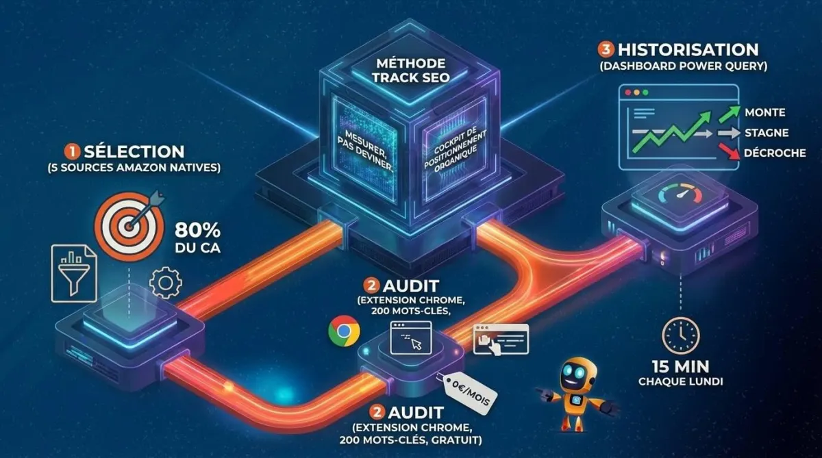 Tu gères 10-30 ASINs. Tu sais que Brand Analytics existe, tu connais la PRR, mais tu n'as pas de processus structuré pour suivre le positionnement organique de chaque produit. Tu veux un cockpit SEO propre, pas un tableur bricolé.