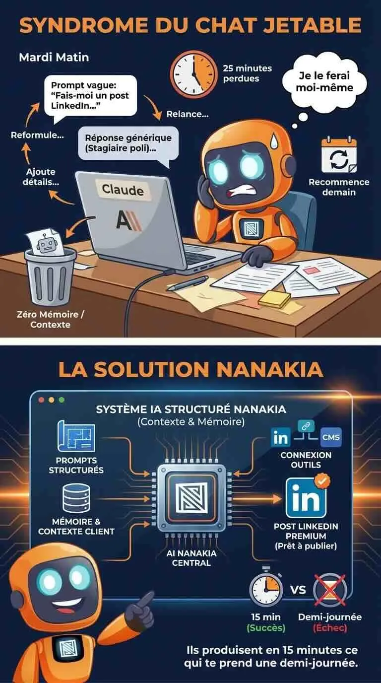 Tu utilises déjà Claude ou ChatGPT, mais tes résultats sont aléatoires. Un jour c'est génial, le lendemain c'est inutilisable. Tu ne comprends pas pourquoi le même prompt donne des résultats différents. Tu sens que tu passes à côté de quelque chose.