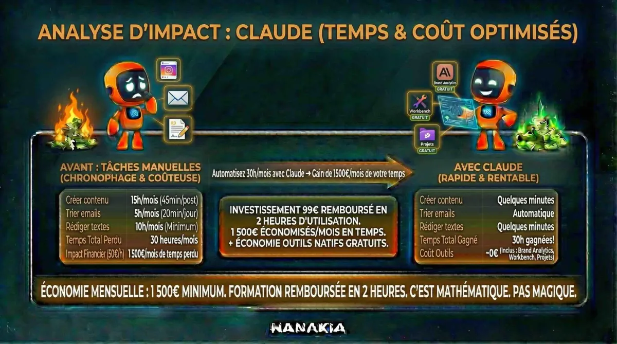 Et on ne parle même pas du coût des outils que tu n'auras plus besoin de payer. Parce que Brand Analytics, le Workbench, les Projets Claude — c'est gratuit. Natif. Déjà dans l'outil.