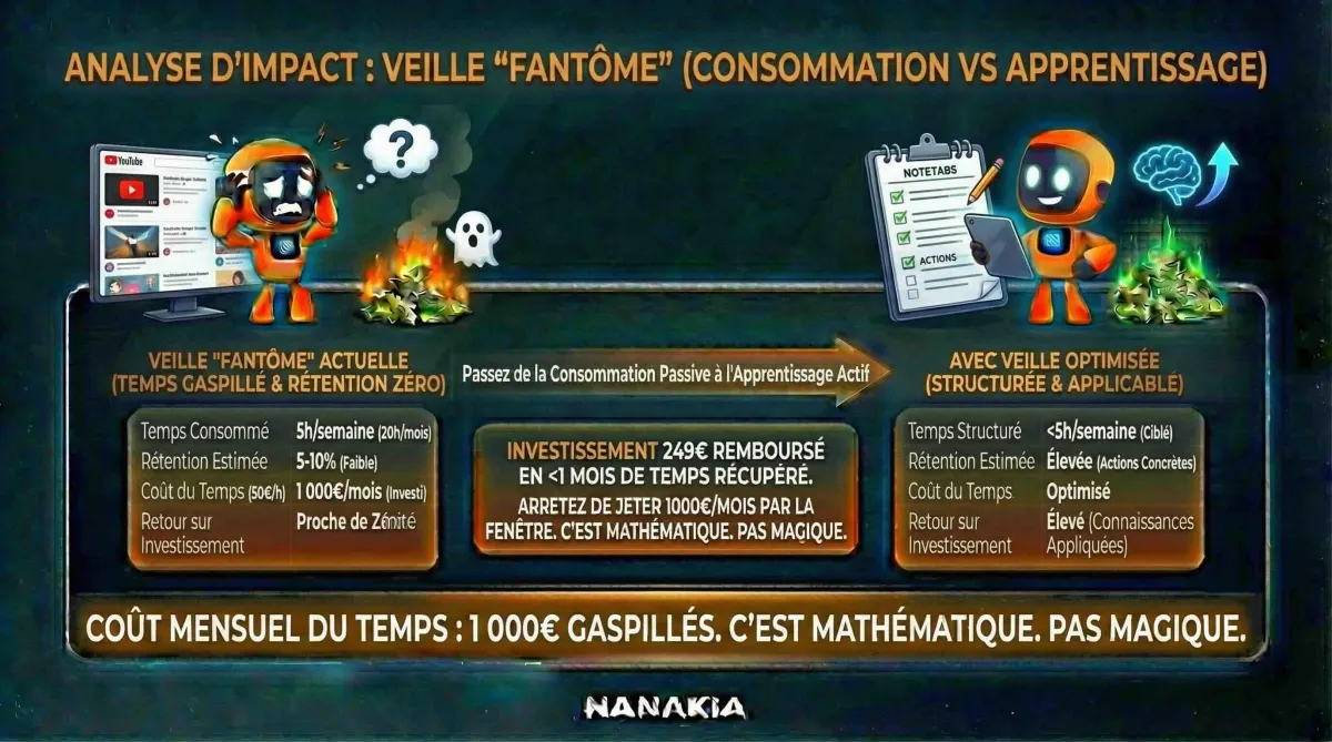 5h/semaine × 4 = 20h/mois de contenu consommé. À 50€/h (ton taux horaire), c'est 1 000€/mois de temps investi. Pour un retour proche de zéro.