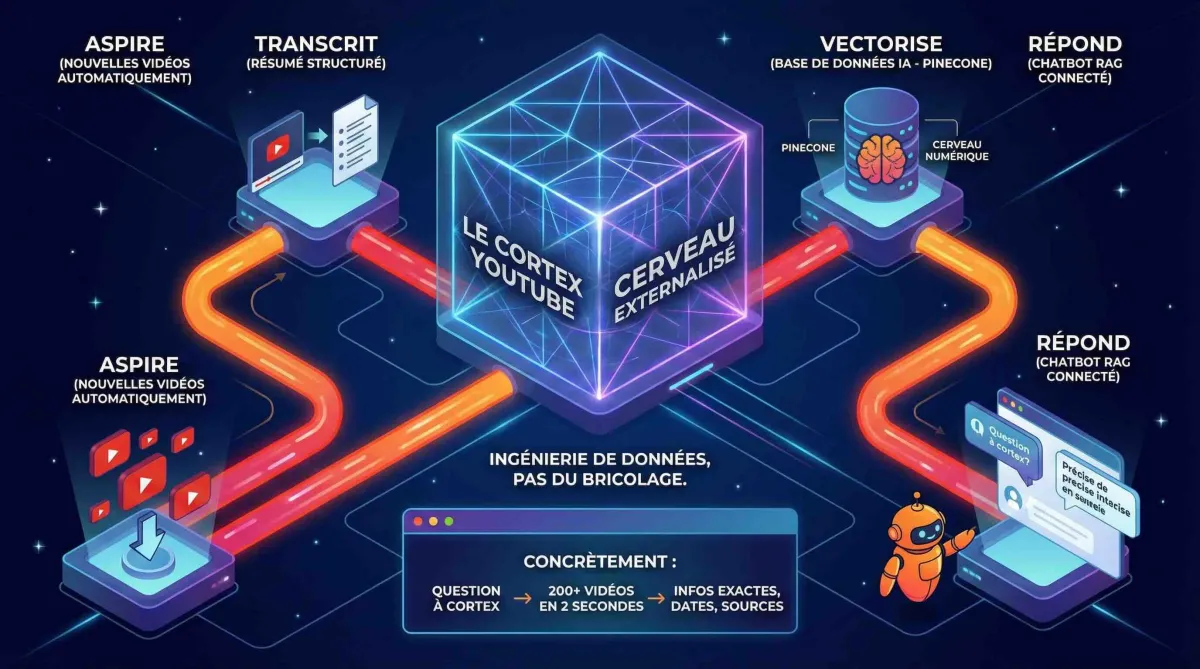 Résultat : Tes vidéos YouTube deviennent une base de données interrogeable par l'IA. 200+ vidéos stockées gratuitement sur Pinecone.