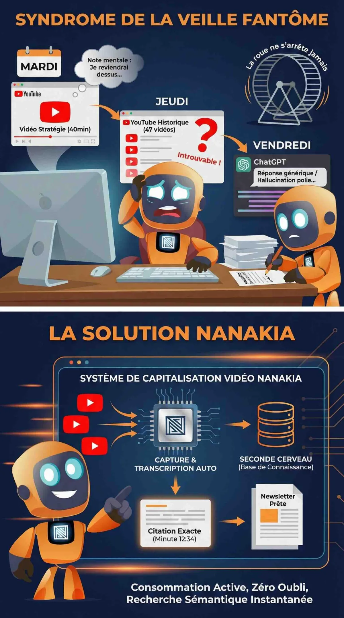 Vendredi. Tu veux écrire ta newsletter. Tu as besoin d'un chiffre, d'une citation, d'un angle. Tu sais que tu l'as vu quelque part. Mais où ? Dans quelle vidéo ? À quelle minute ?