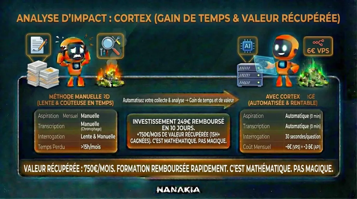 Temps récupéré : 15h+ par mois. Valeur récupérée à 50€/h : 750€/mois.