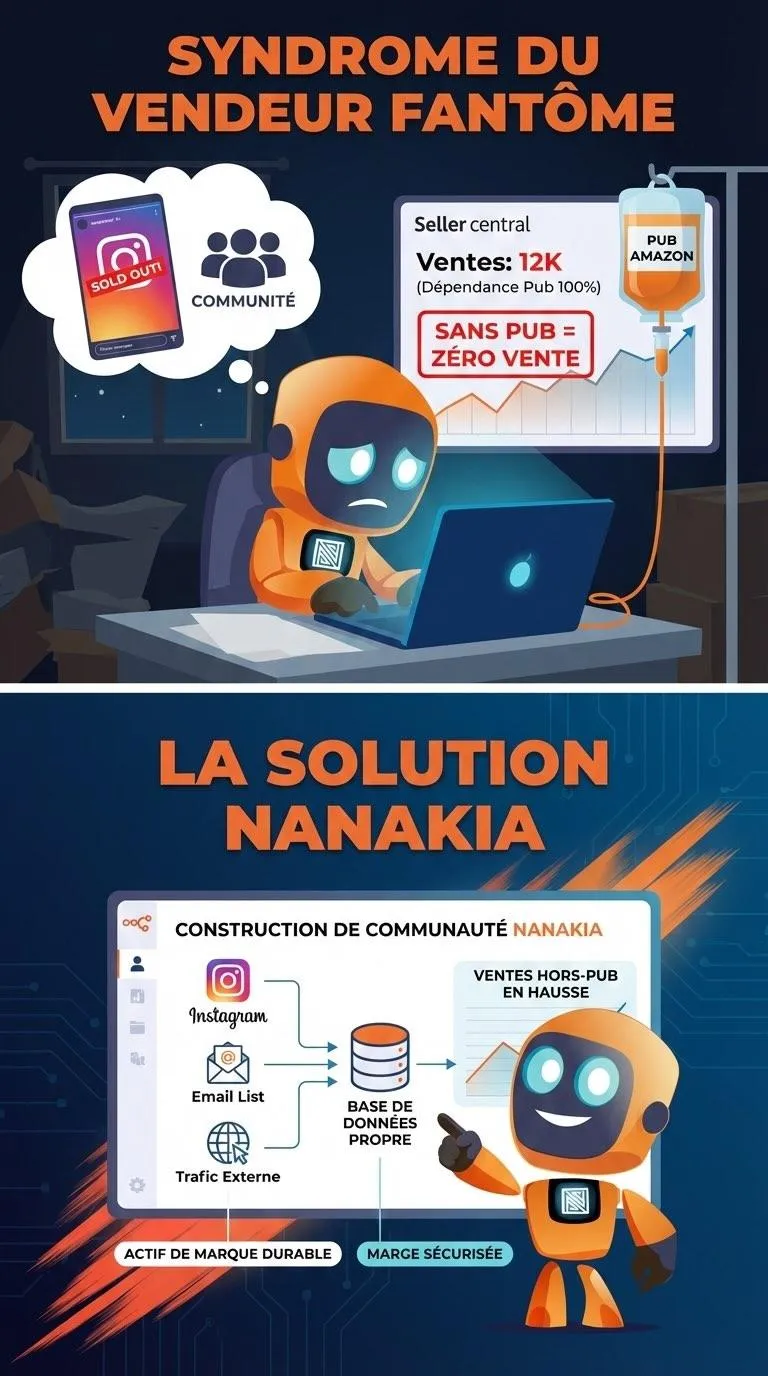 tu existes sur Amazon, mais tu n'existes NULLE PART ailleurs. Pas de communauté. Pas de trafic externe. Pas d'identité de marque.