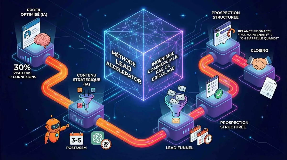 PROFIL OPTIMISÉ (IA) ➡️ CONTENU STRATÉGIQUE (IA) ➡️ LEAD FUNNEL ➡️ PROSPECTION STRUCTURÉE ➡️ CLOSING