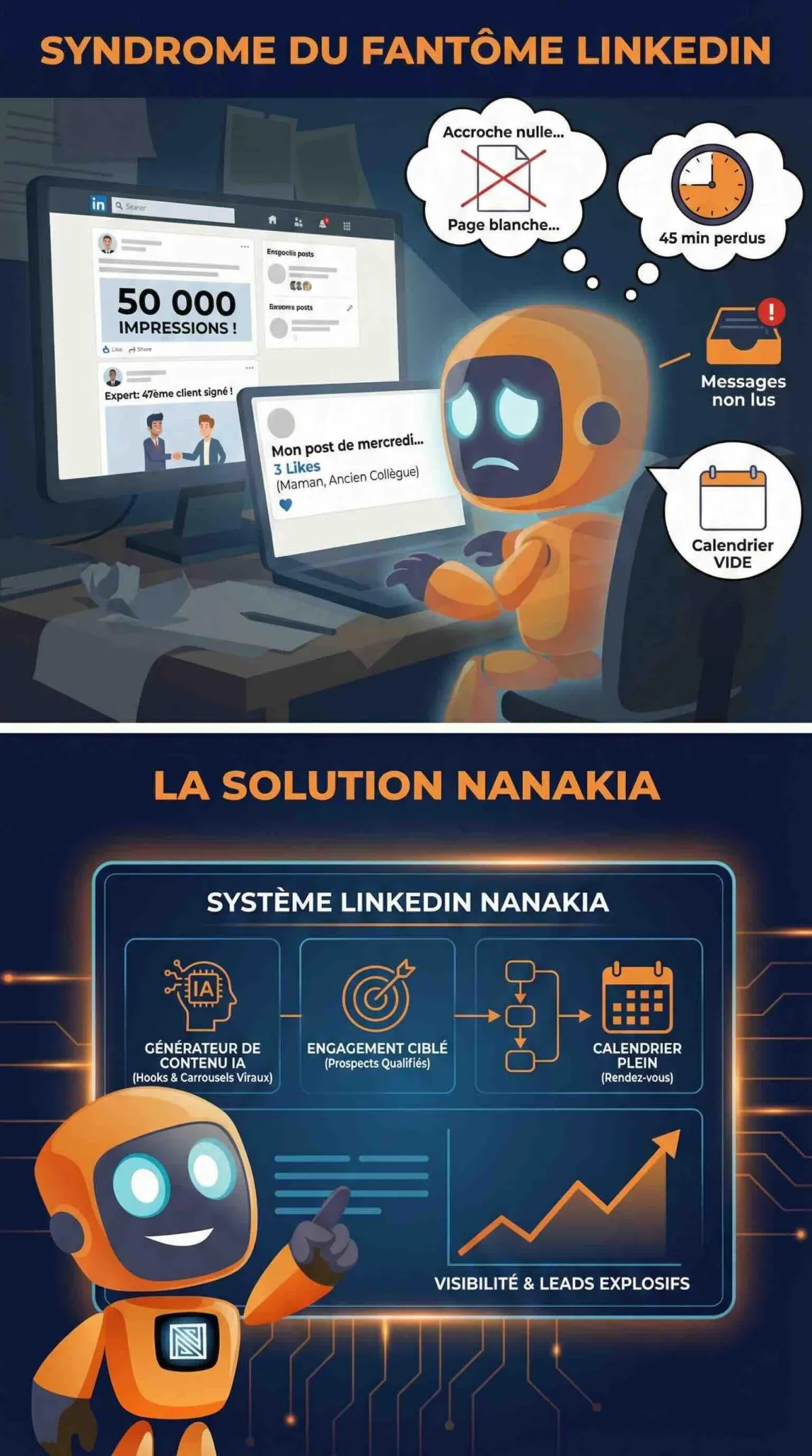 Pendant ce temps, ta messagerie LinkedIn : des demandes de connexion que tu n'exploites pas. Des prospects potentiels que tu n'oses pas contacter. Et ce formulaire de calendrier que personne ne remplit.