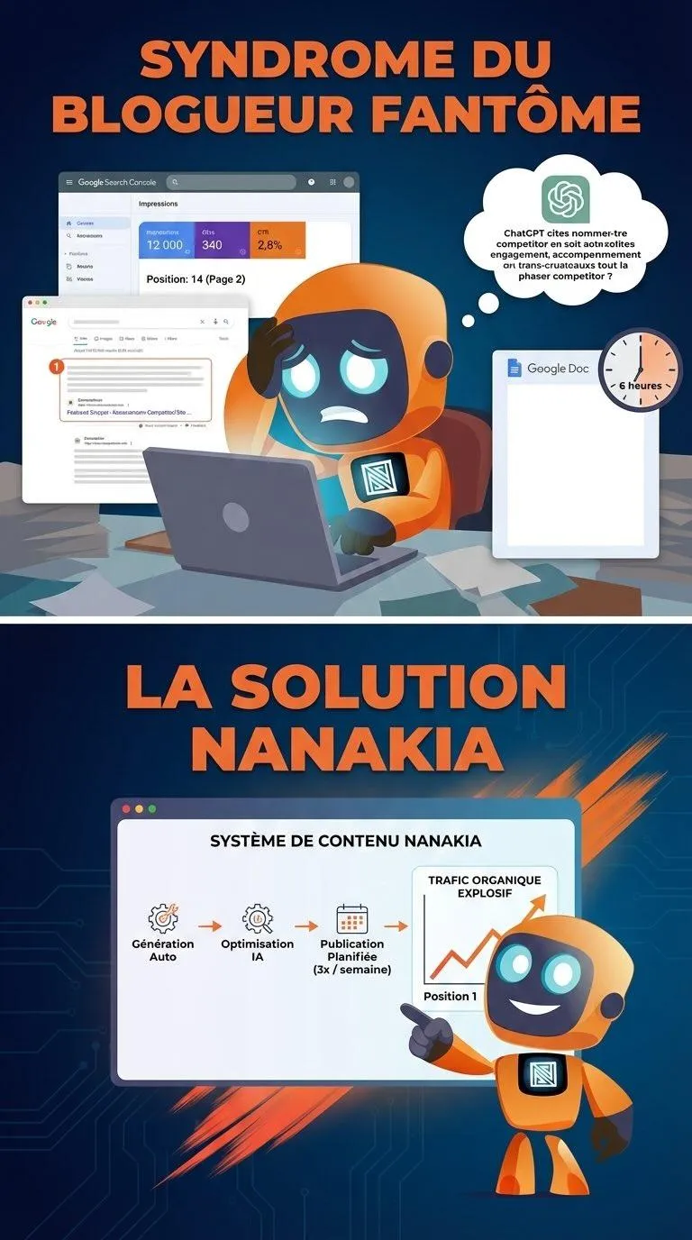 Tu écris tes articles, tu fais ta recherche de mots-clés sur Ubersuggest ou Semrush, tu optimises tant bien que mal. Mais entre 2 et 4 articles par mois, tu n'arrives pas à créer la masse critique pour que Google te considère comme une référence. Et tu passes 8 à 10 heures par semaine là-dessus.