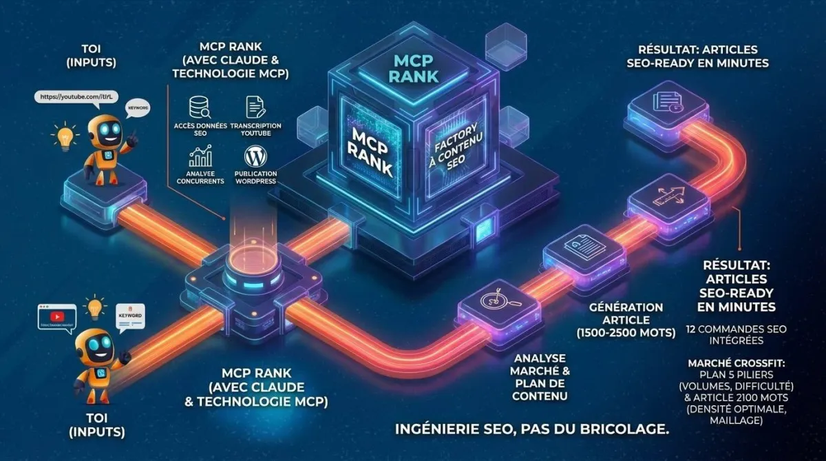 Grâce à la technologie MCP (Model Context Protocol), tu donnes à Claude des bras supplémentaires : accès aux données SEO réelles, transcription YouTube, analyse de concurrents, publication WordPress.