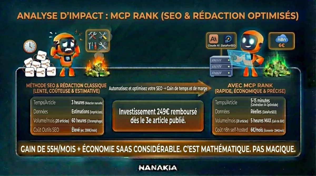 → Ce que tu obtiens : Une infrastructure propriétaire. Claude + MCP + n8n. Données réelles via DataForSEO. Publication directe sur WordPress. Le tout pour 249€ une fois — au lieu de 500€/mois à vie.