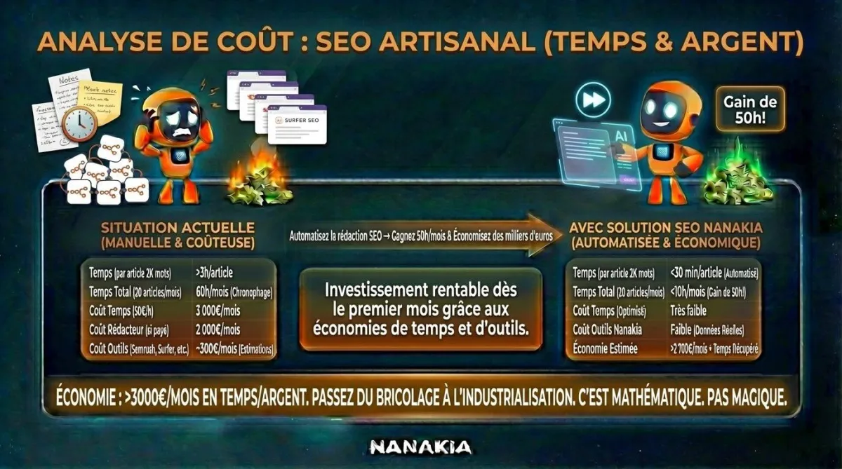 Tu as Semrush à 120€/mois, peut-être Surfer SEO à 89€, un rédacteur freelance à 100€ l'article. Tu dépenses 500€+ par mois en stack SEO. Et tu te demandes si tout ça ne pourrait pas être automatisé. Tu as raison.