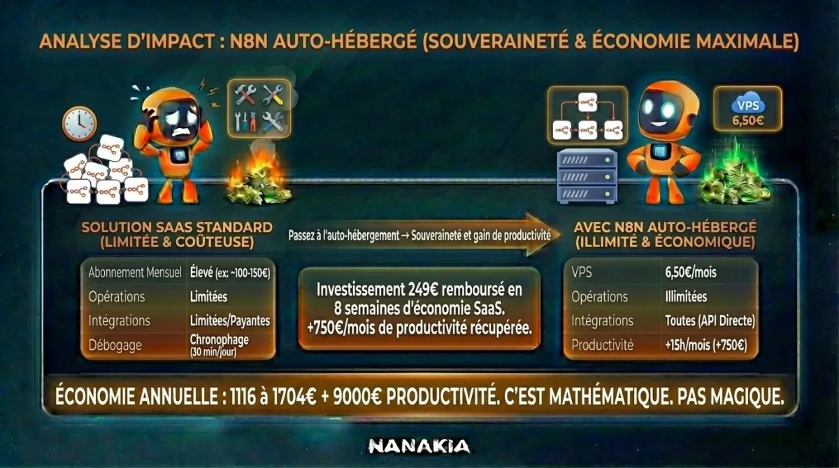 Pourquoi c'est clé : C'est la différence entre payer 24€/mois à n8n Cloud et 6€/mois en souverain. Sur 12 mois, tu économises 216€ — rien que sur ce bonus.