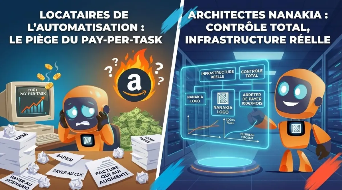 80% des entrepreneurs qui "font de l'automatisation" sont en réalité des locataires. Locataires de Make. Locataires de Zapier. Locataires de templates qu'ils ne comprennent pas. Ils paient au clic, au scénario, à l'opération — et leur facture augmente à chaque fois que leur business grossit.