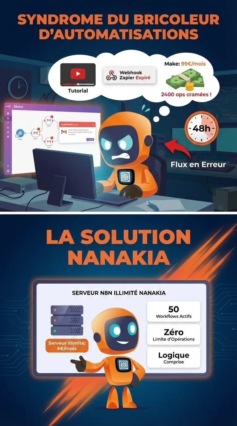 Tu empiles des nœuds sans comprendre la logique. Tu copies des workflows sans savoir les déboguer. Tu paies Make pour 1 200 intégrations dont tu utilises 4. Et chaque mois, la facture tombe — que tes flux marchent ou non.