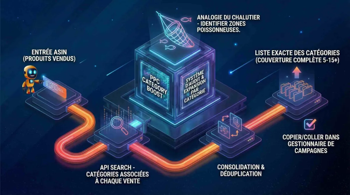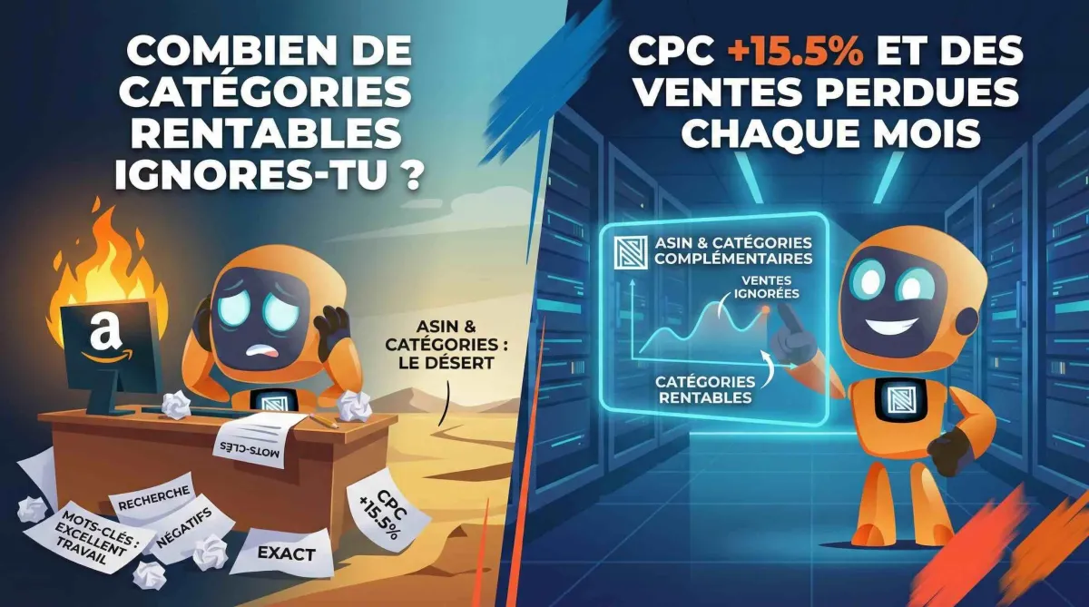 Tu gères 5 à 30 ASIN. Tu fais tes analyses hebdo. Tu extrais tes Search Terms, tu négatises, tu optimises tes enchères. Mais tu sais que ton travail sur les catégories est incomplet. Chaque semaine, tu découvres des ASIN qui font des ventes dans des catégories que tu ne ciblais pas — et tu perds du temps à aller vérifier manuellement sur chaque fiche produit.