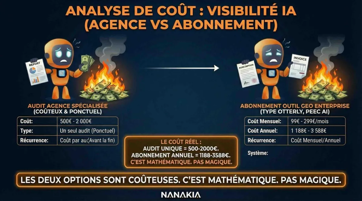 Abonnement à un outil GEO enterprise (type Otterly, Peec AI) : 99 à 299€/mois.