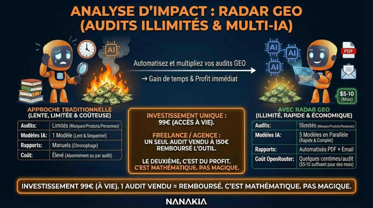Et si tu es freelance/agence ? Un seul audit GEO vendu 150€ à un client rembourse l'outil. Le deuxième, c'est du profit.