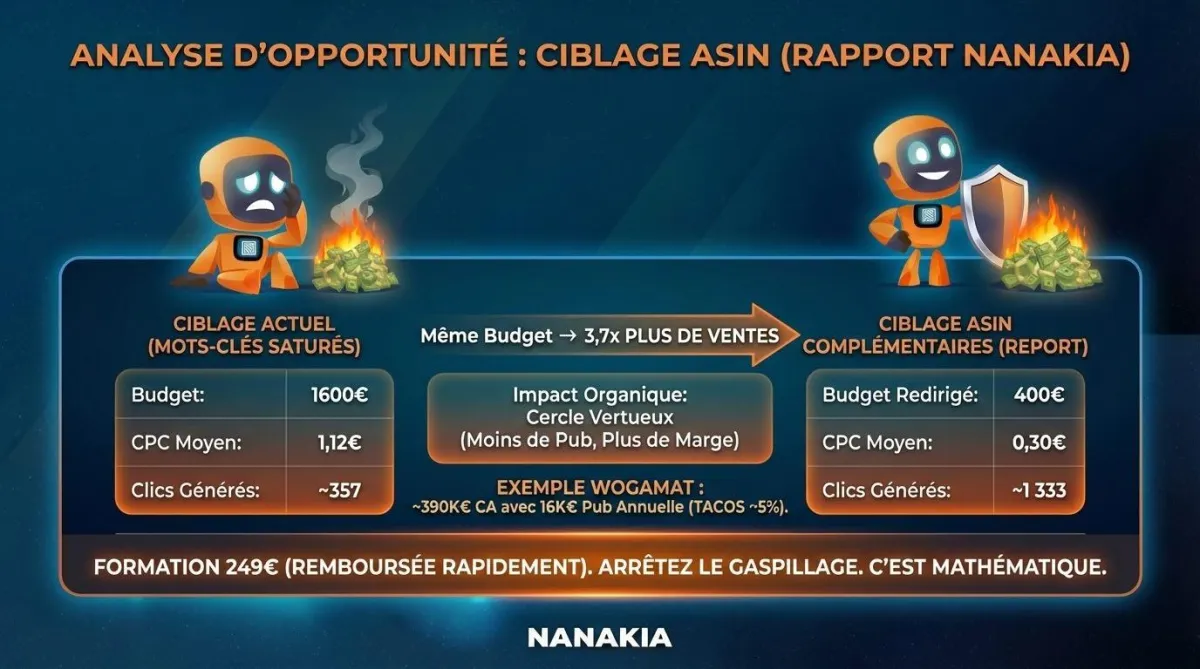 Maintenant, imagine que tu rediriges ne serait-ce que 20% de ce budget — 400€ — vers des ASINs complémentaires identifiés par ce rapport.