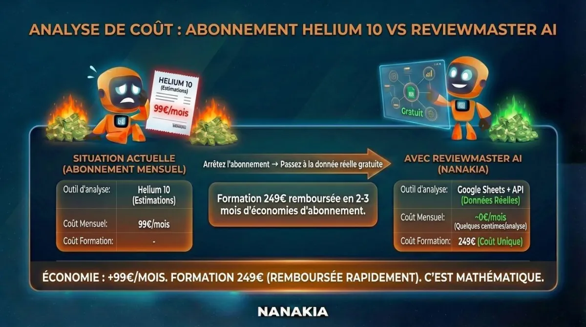 Alors tu fais ce que tout le monde fait : tu ouvres Helium 10. Tu paies 99€/mois pour des estimations. Tu regardes les avis de tes concurrents… un par un. À la main. Tu copies-colles dans un Google Doc. Au bout de 30 minutes, tu abandonnes.