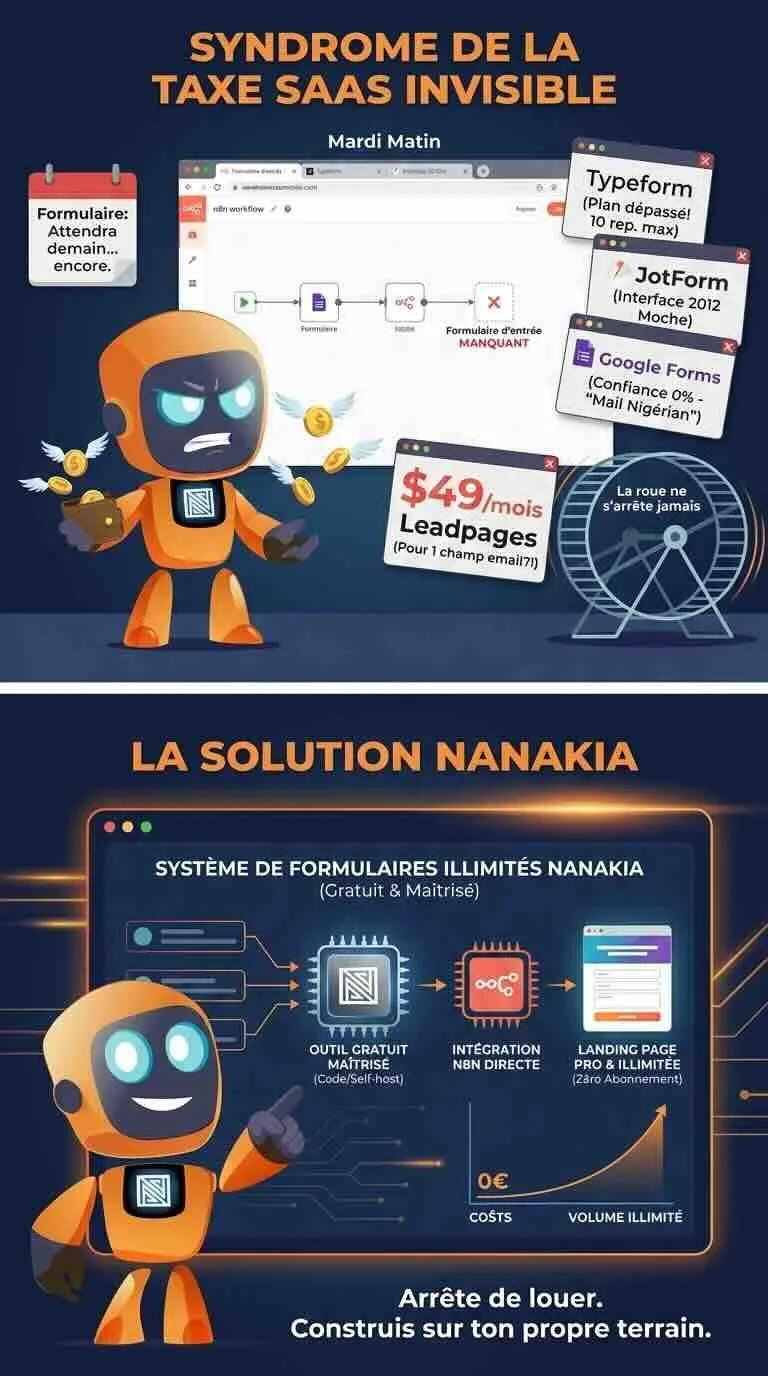 Tu as tes workflows n8n en place, mais tes formulaires d'entrée sont bricolés avec Google Forms ou des outils payants. Chaque nouveau funnel = un nouvel abonnement. Tu veux un point d'entrée propre, gratuit, et connecté à ton infrastructure.