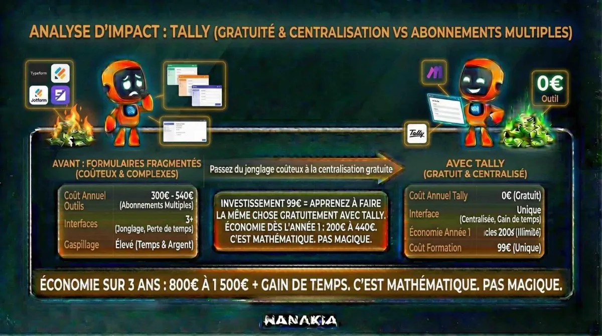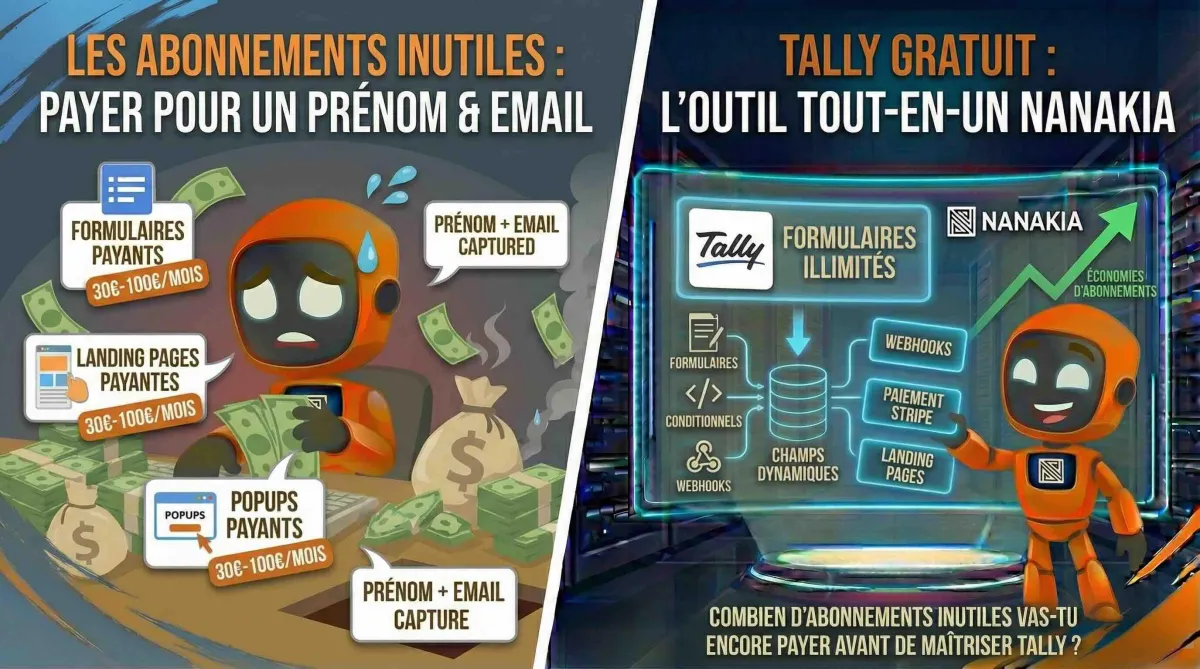 Aujourd'hui, tous les formulaires de l'écosystème NANAKIA tournent sur Tally — inscriptions, accès VIP, questionnaires qualifiants, pages de capture. Zéro euro d'abonnement formulaire.