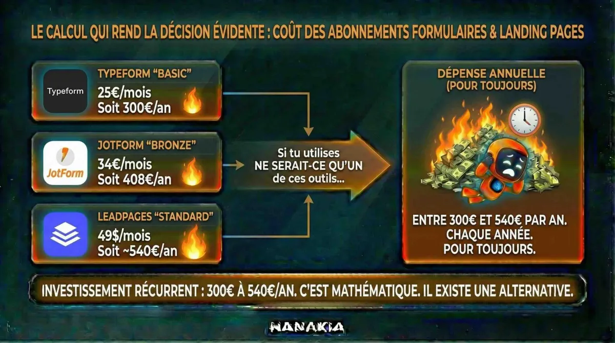 Si tu utilises ne serait-ce qu'UN de ces outils pour tes formulaires et landing pages, tu dépenses entre 300€ et 540€ par an. Chaque année. Pour toujours.