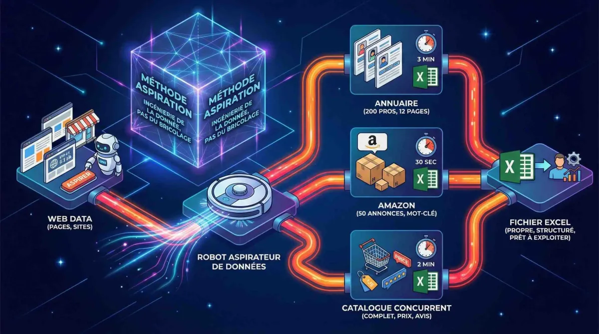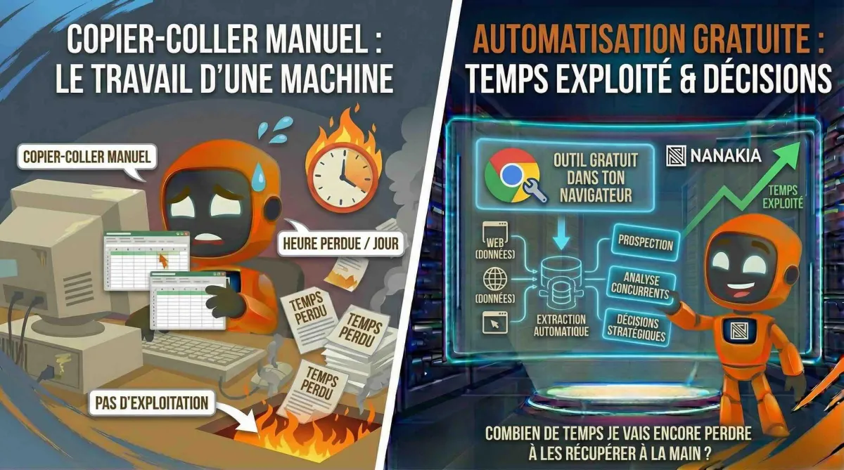Chaque heure que tu passes à copier-coller des données, c'est une heure que tu ne passes pas à les exploiter. Pas à prospecter. Pas à analyser tes concurrents. Pas à prendre des décisions.